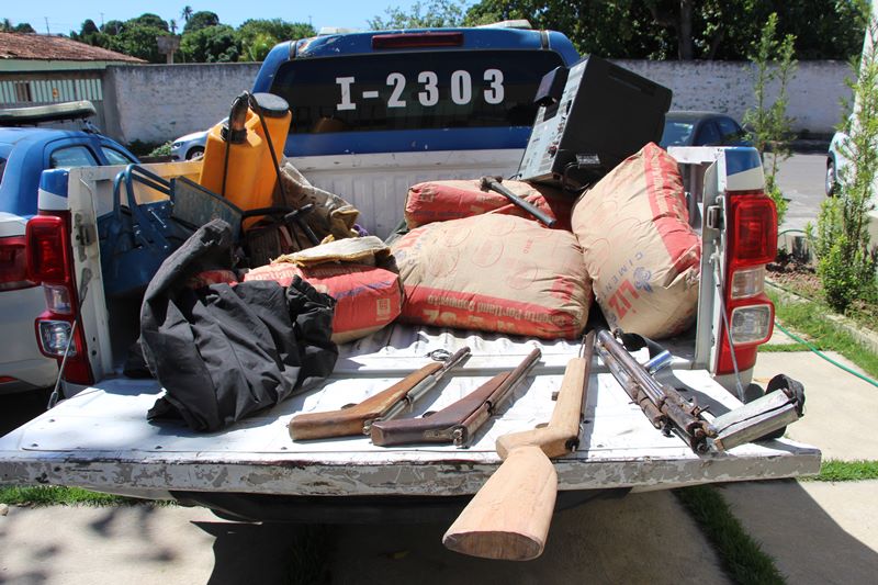Após um assalto praticado por uma quadrilha no assentamento 3 de julho, zona rural de Eunápolis, onde foram subtraídos vários objetos e uma das vítimas foi estuprada pelos bandidos, a Polícia Civil através da delegacia de repressão a furtos e roubos sob o comando do delegado Hermano Costa deu início às investigações e nesta sexta-feira (03), os investigadores fora na casa de um dos suspeitos no bairro Alecrim II, onde encontraram os objetos roubados e apreenderam quatro espingardas de fabricação caseira todas funcionado.