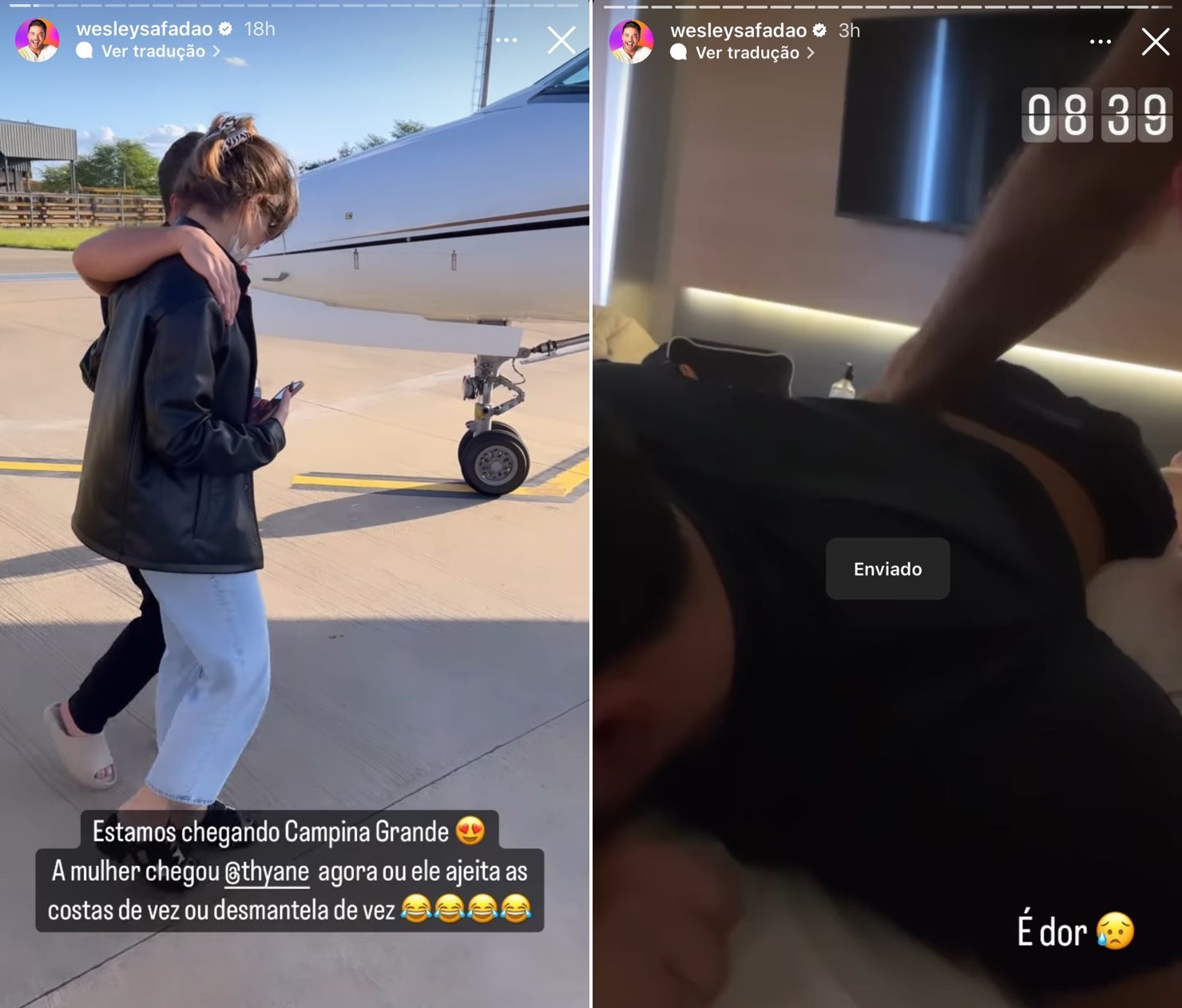 Na manhã deste sábado (25), o cantor publicou um story no Instagram recebendo massagem nas costas e escreveu: 'É dor'.