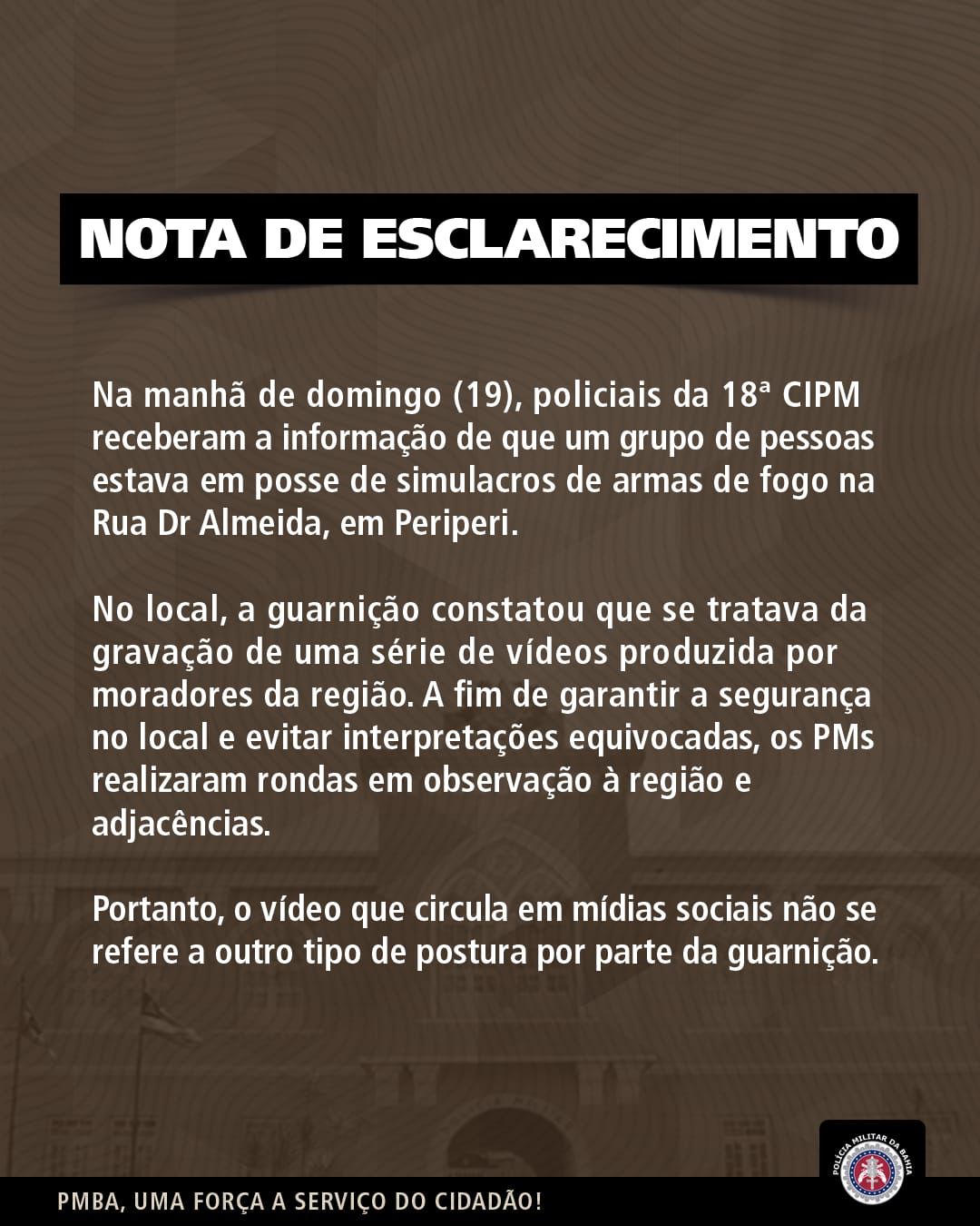 A Polícia Militar da Bahia (PM-BA) emitiu uma nota a respeito de um vídeo falso, divulgado nas redes sociais, onde a corporação teria sido acionada para realizar uma apreensão de armas de fogo, no domingo (18), na Rua Dr. Almeida, no bairro de Periperi, Subúrbio Ferroviário de Salvador.